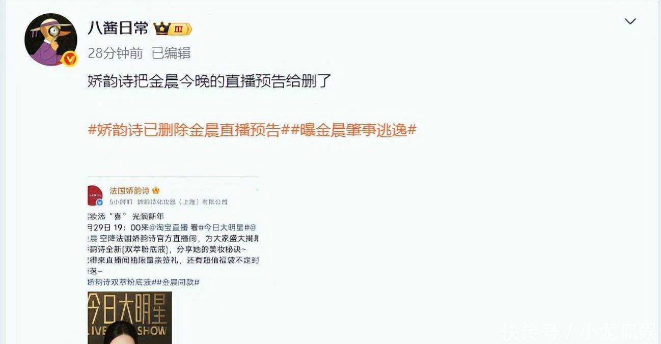 如果说,这一方面坐实,那么金晨将会面对巨大的反噬。大约下午时分,金晨代言的娇韵诗已经将其直播的预告给删除。看似很小的举动,实则却预示了此事的不简单,再加上现场照的曝光,以及诸多细节,也许真的“恐凉凉”。