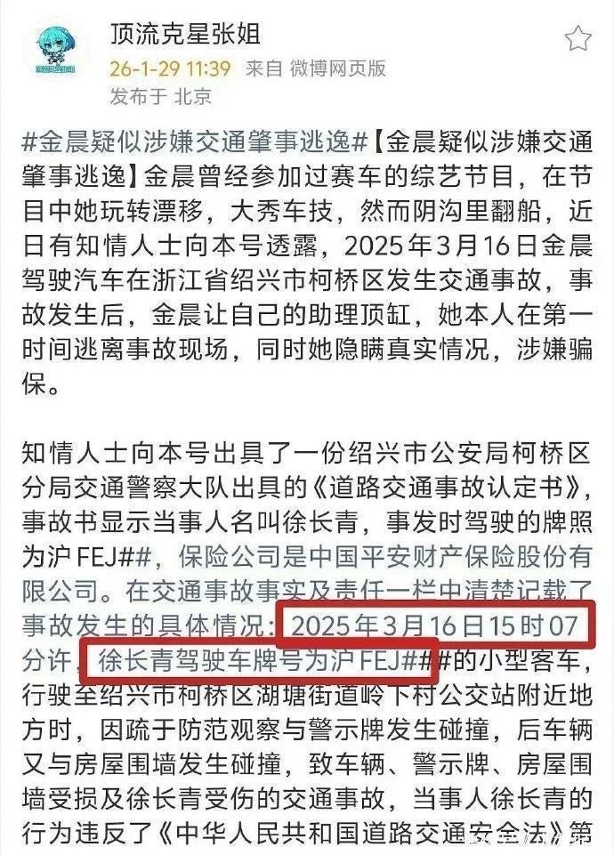 1月29号中午,金晨被曝大瓜,原本是很小的交通事故,没想到因为态度等问题迎来反转,如果当时亲自处理,且认认真真接受相关法规的惩罚,绝对不会有如今的遭遇,只能说经纪人有问题,而她本人也有巨大的态度问题。